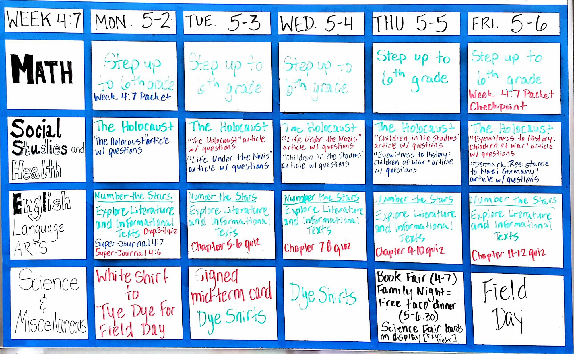 Week 4:7 (May 2-6) April 29, 2016 by Mrs. Benton Share this: Click to share on X (Opens in new window) X Click to share on Facebook (Opens in new window) Facebook Like Loading...