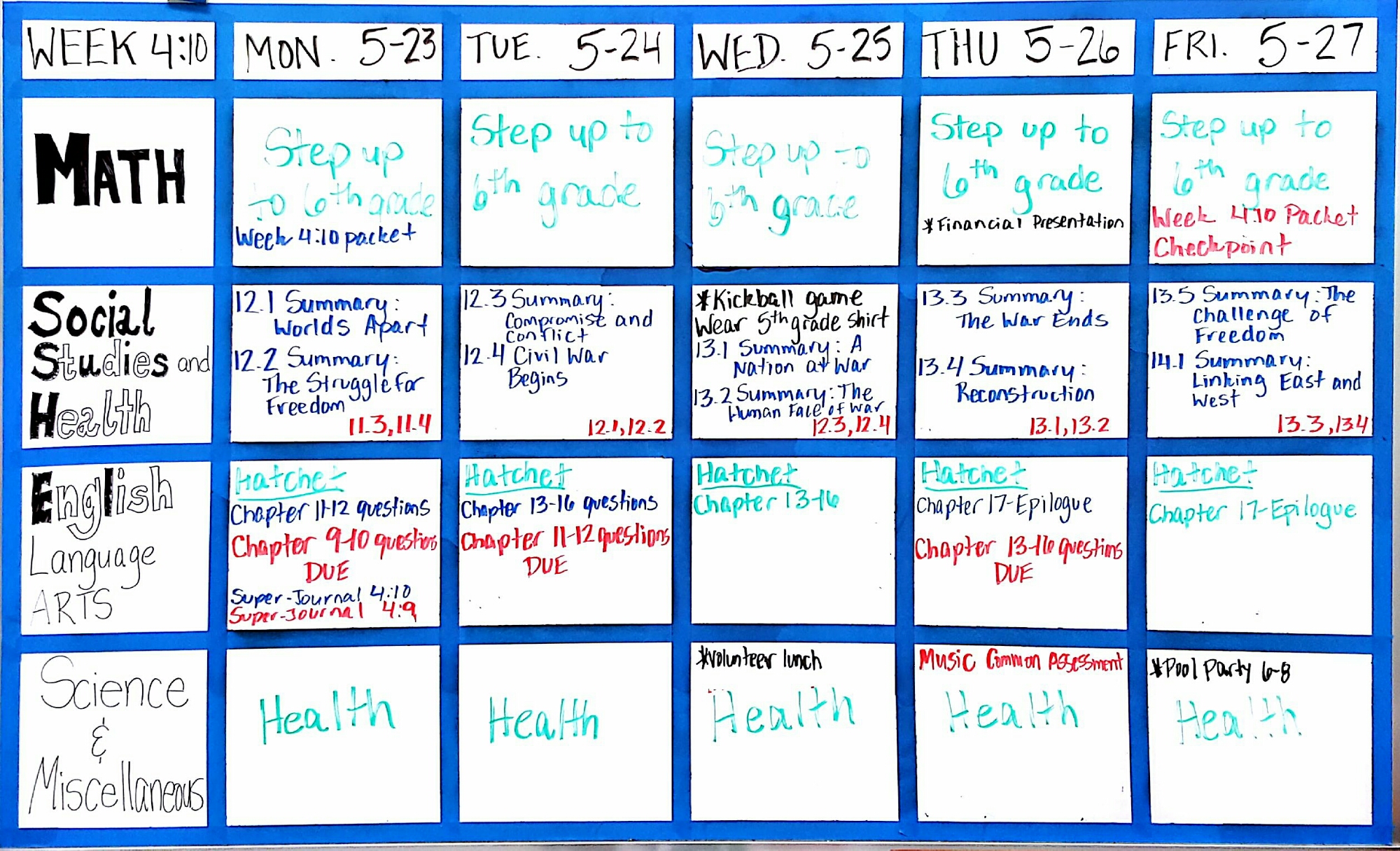 Week 4:10 (May 23-27) May 20, 2016 by Mrs. Benton Share this: Click to share on X (Opens in new window) X Click to share on Facebook (Opens in new window) Facebook Like Loading...