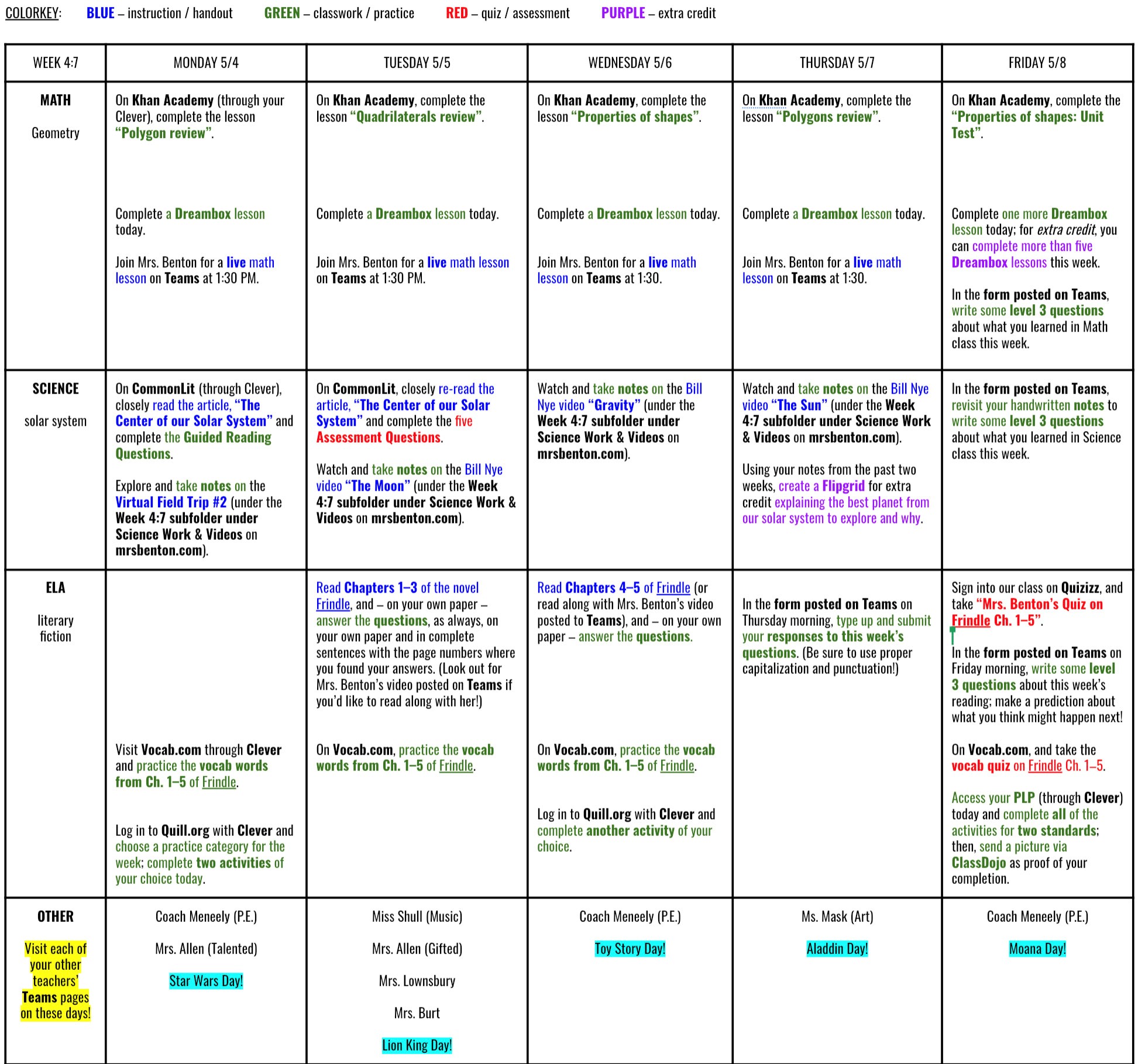Week 4:7 (May 4-8) May 3, 2020 by Mrs. Benton Use Clever.com to access Teams every day for attendance, live lessons, and class meetings. Frindle e-text Frindle questions Math Work & Videos Science Work & Videos Share this: Click to share on X (Opens in new window) X Click to share on Facebook (Opens in new window) Facebook Like Loading...