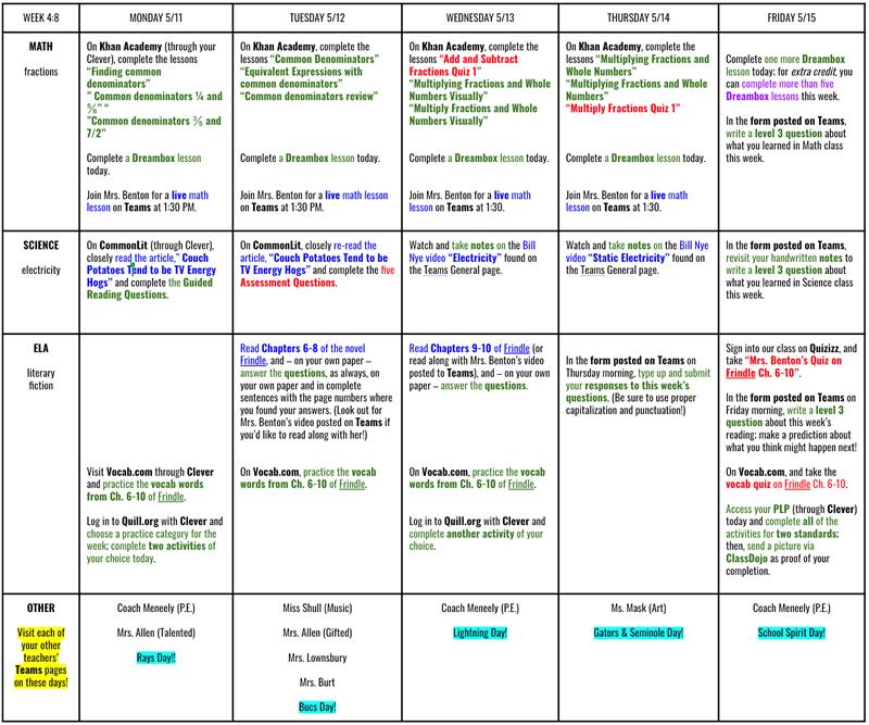 Week 4:8 (May 11-15) May 10, 2020 by Mrs. Benton Use Clever.com to access Teams every day for attendance, live lessons, and class meetings. Frindle e-text Frindle questions Math Work & Videos Science Work & Videos Hatchet movie Share this: Click to share on X (Opens in new window) X Click to share on Facebook (Opens in new window) Facebook Like Loading...