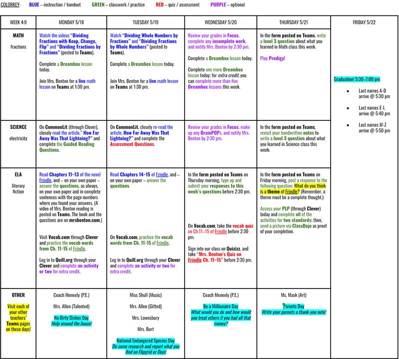 Week 4:9 (May 18-22) May 17, 2020 by Mrs. Benton Use Clever.com to access Teams every day for attendance, live lessons, and class meetings. Frindle e-text Frindle questions Share this: Click to share on X (Opens in new window) X Click to share on Facebook (Opens in new window) Facebook Like Loading...